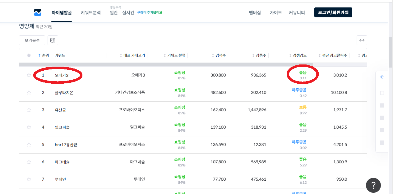 -아이템발굴-카테고리 설정(1차, 2차, 3차, 4차)-기간: 최근30일-키워드 500개 순위 산출됨-키워드 클릭하면 상품종합지표(경쟁강도), 광고종합지표(광고클릭률, 클릭경쟁률), 쿠팡상품지수(쿠팡 경쟁강도) 확인